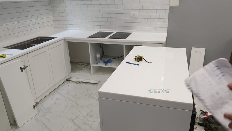 Tủ bếp được ốp bằng đá nhân tạo màu trắng có ưu điểm uốn nắn tuyệt vời, không để lại mấu nối một mạch liền nhau, giúp tăng thêm tính thẩm mỹ cao.